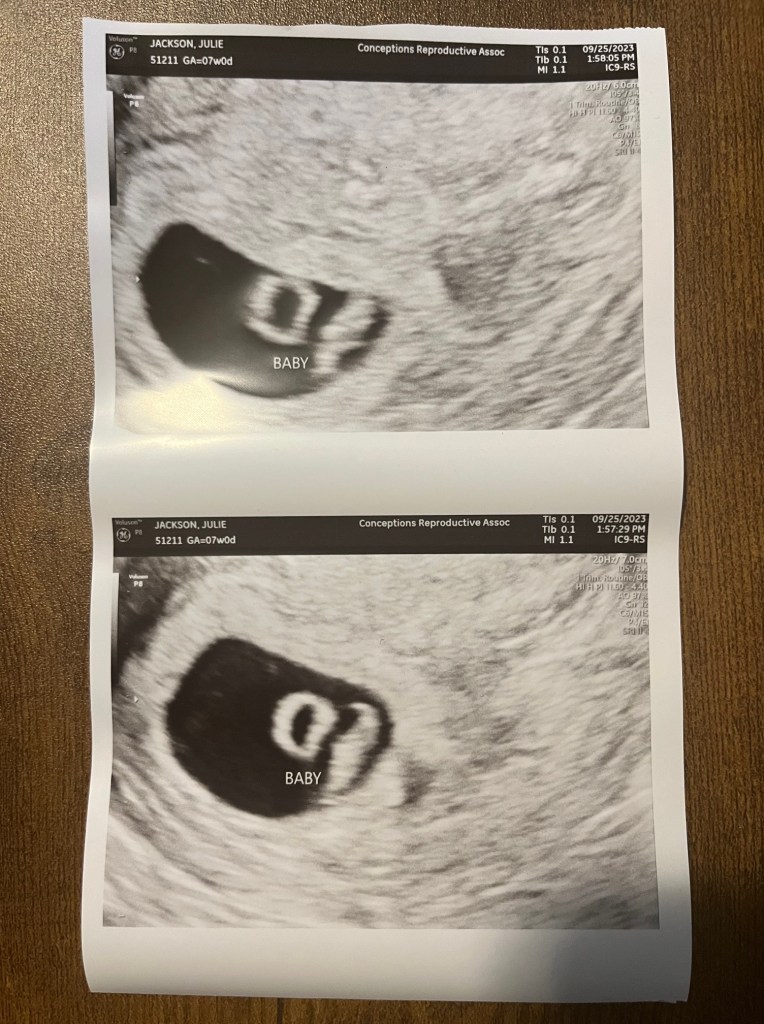 When we found out we were pregnant, I was right at 4.5 weeks. That meant I had to wait a couple of weeks until we did our first ultrasound. It’s not that it was stressful, per se, but it is a weird feeling.