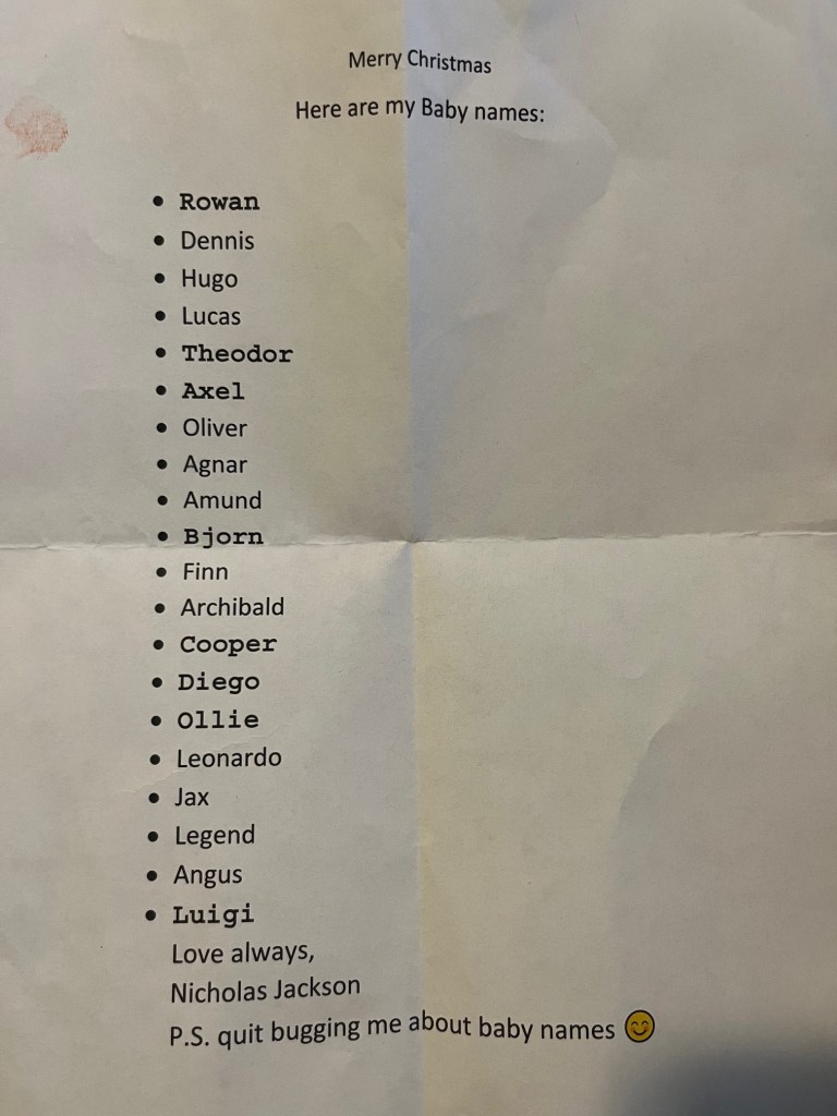 I knew he had texted my sister asking about family names, so I was curious which of those family names would make it to his list.